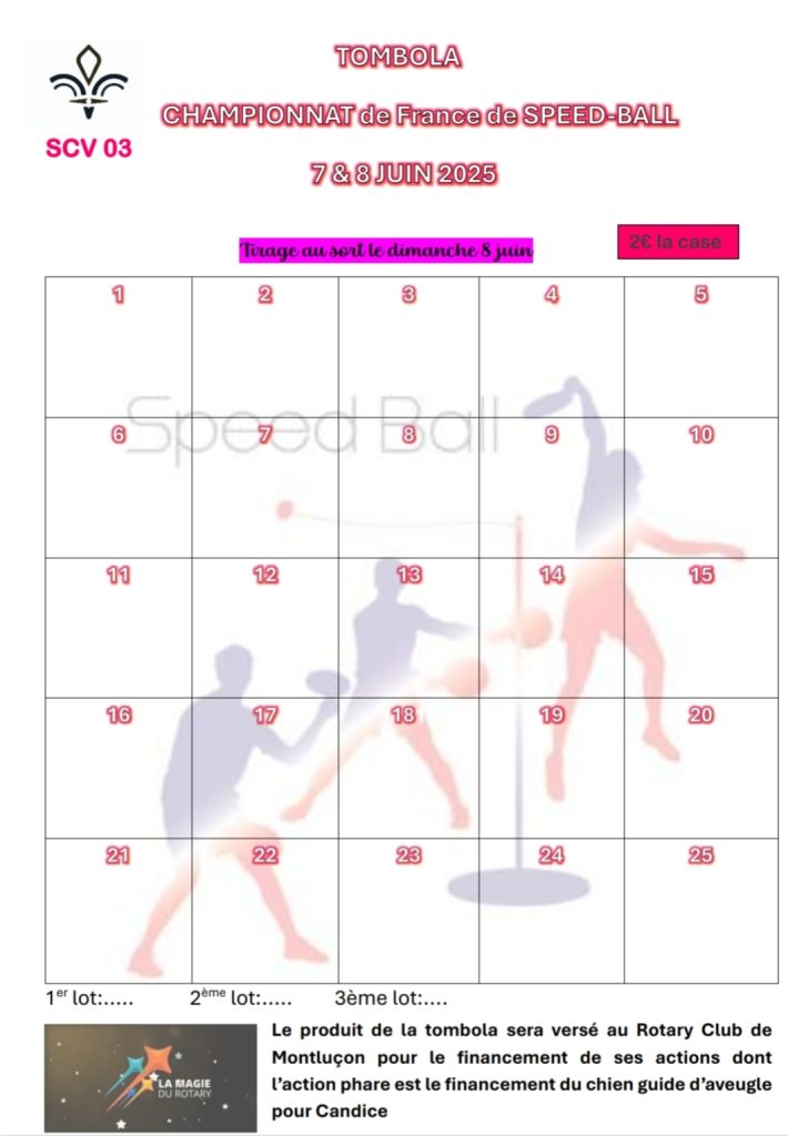 Une tombola est associée à ce tournoi au profit des actions du ROTARY et en particulier celle en faveur du chien guide de Candice. Les billets au prix de 2 euros sont en vente sur place pendant le tournoi.